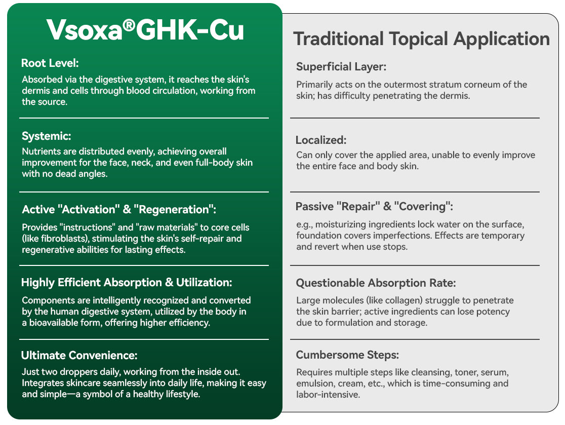 Powered by GHK-Cu and BPC-157, Vsoxaยฎ works from the inside out to restore firmness, hydration, and youthful glowโevery day, even while you sleep. No painful injections. No complicated routines. Just real, lasting results.